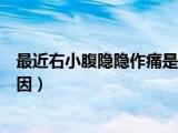 大家好,linda来为大家解答以上的问题。最近右小腹隐隐作痛是什么原因,右小腹隐隐作痛是什么原因很多人还不知道,现在让我们一起来看看吧 浏览全文>>